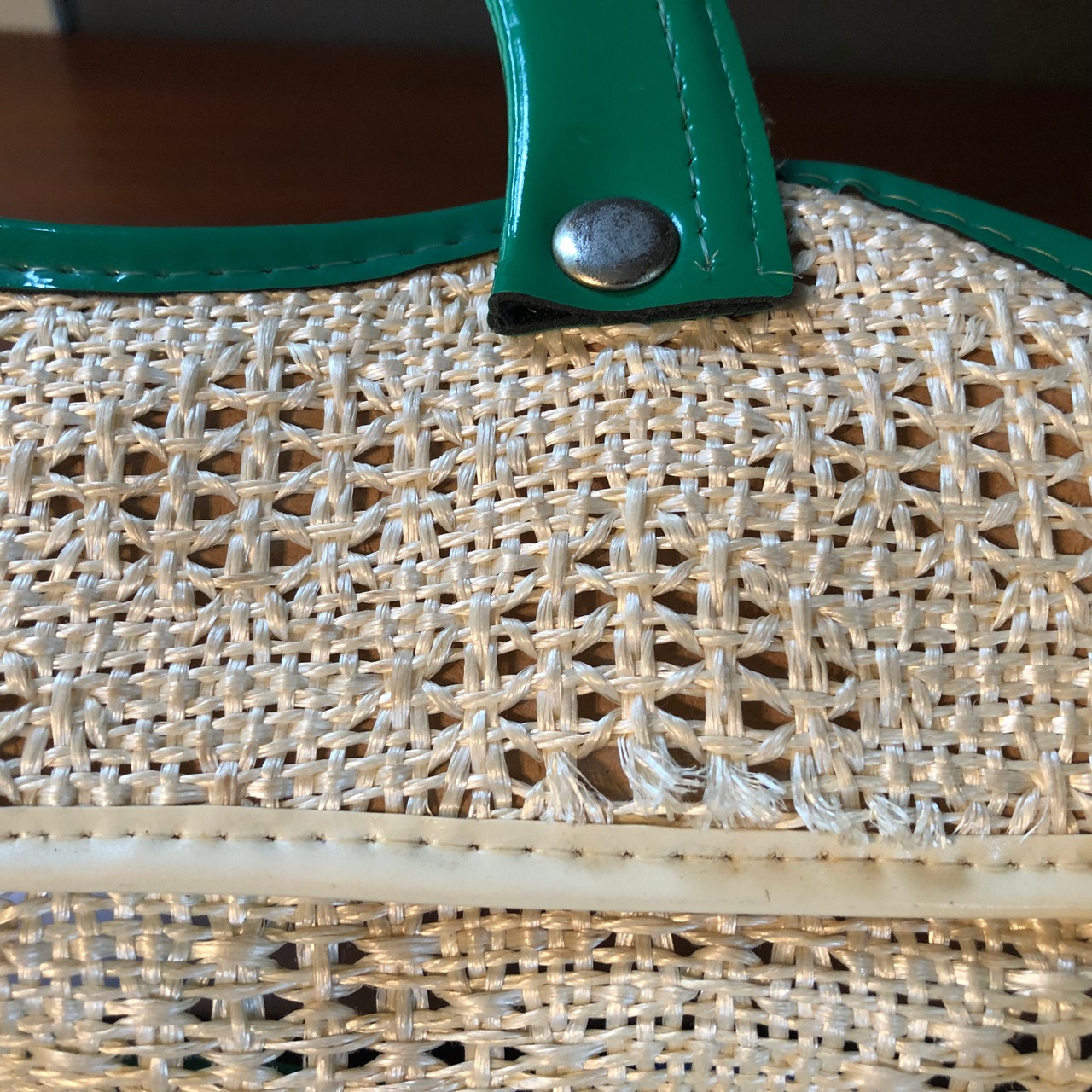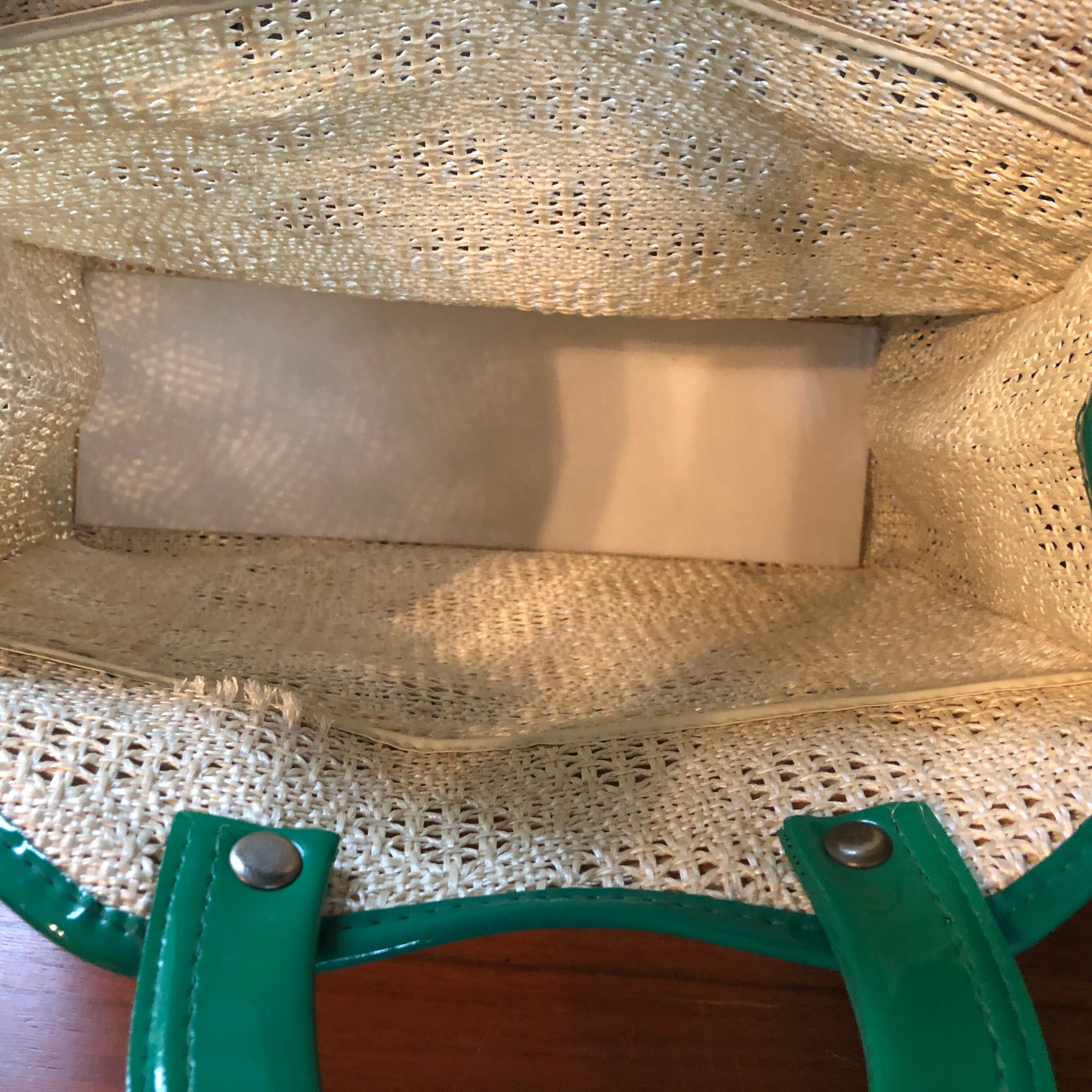 濃いグリーンのビニル素材とのコンビネーションがレトロでかわいい籠バッグ。