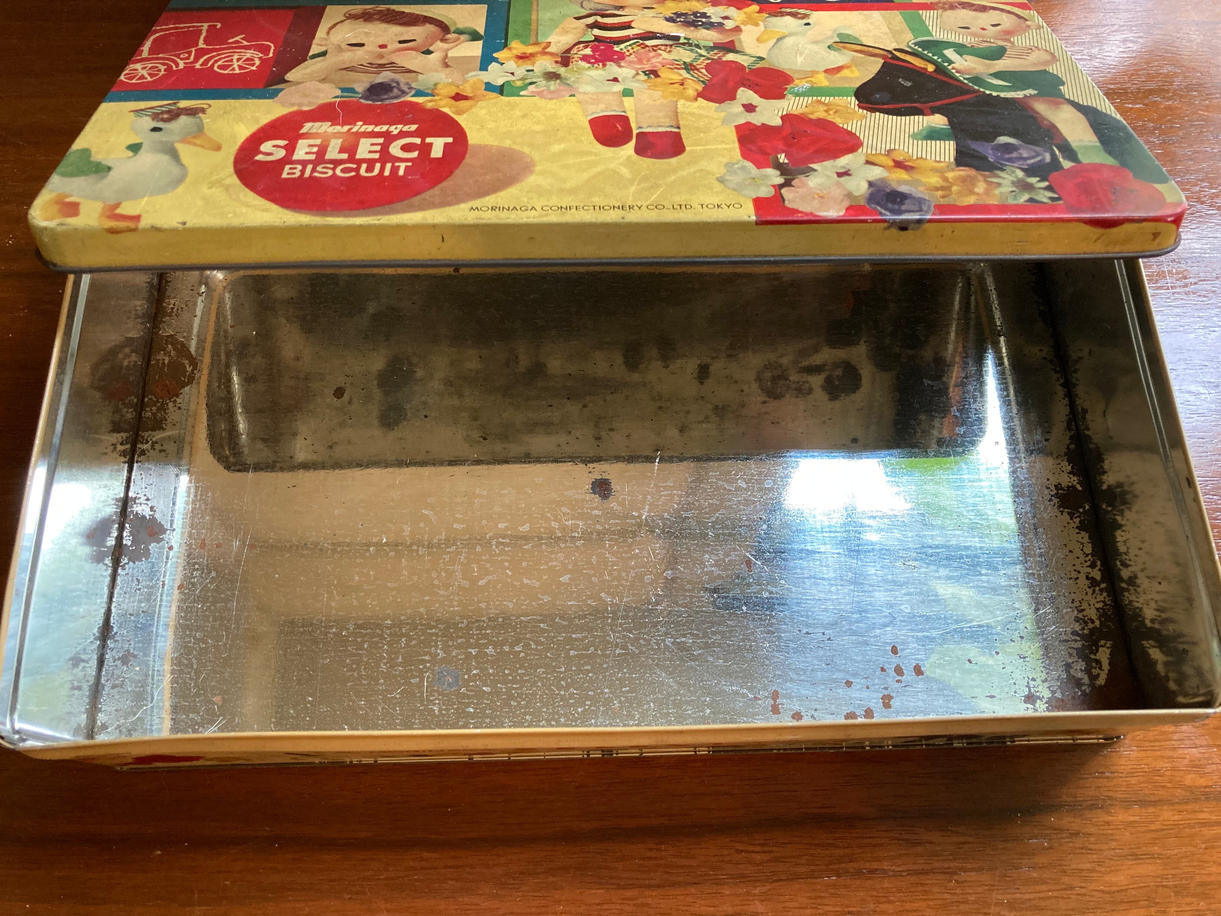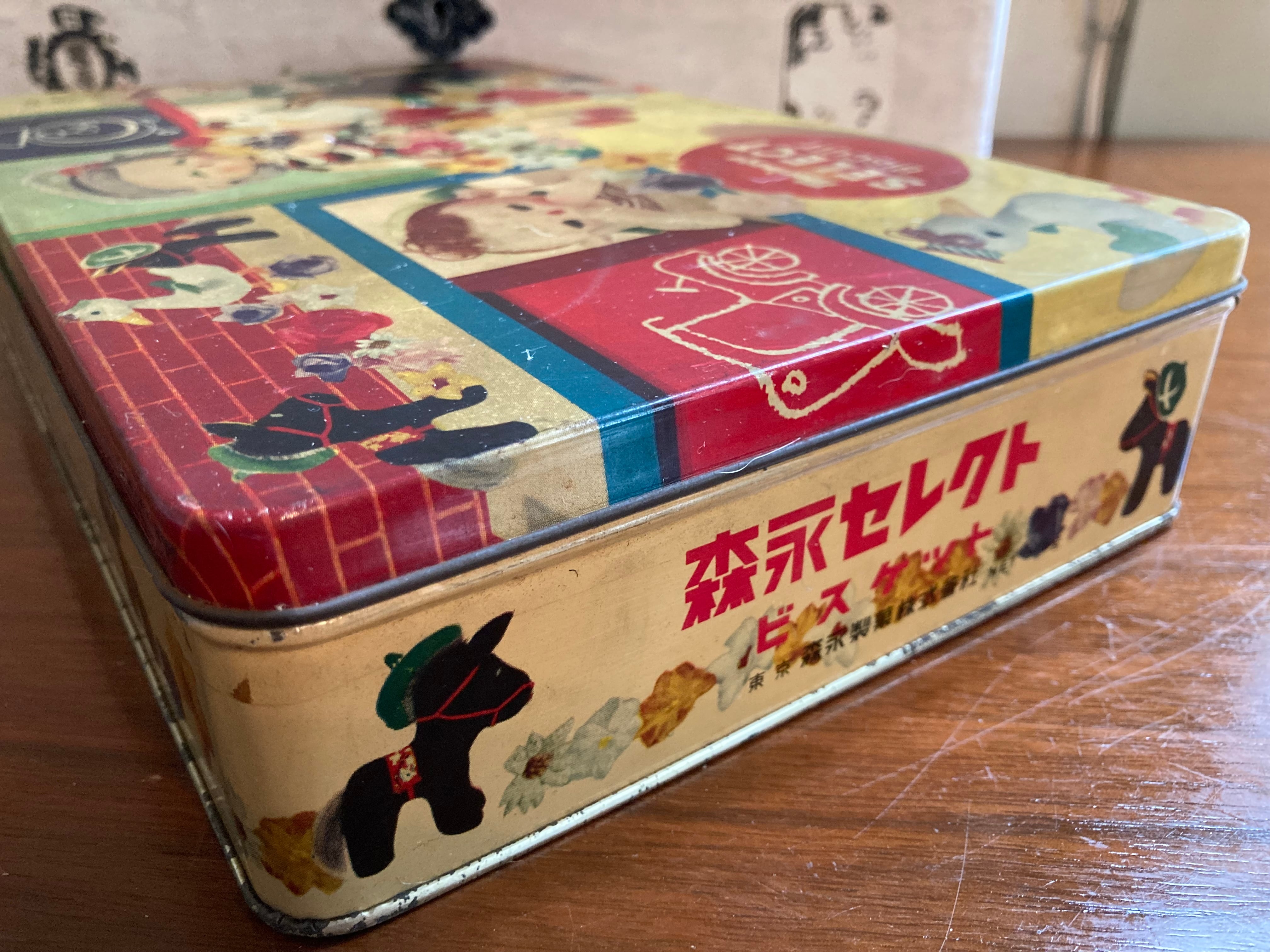 昔ながらの味わいとレトロなデザインが魅力の詰め合わせビスケットの空き缶です。経年による汚れや色褪せがあるため、まるで懐かしいアイテムを手にしたかのような感覚に浸れます。人形の絵柄が可愛らしく、どこかノスタルジックな雰囲気が漂います。